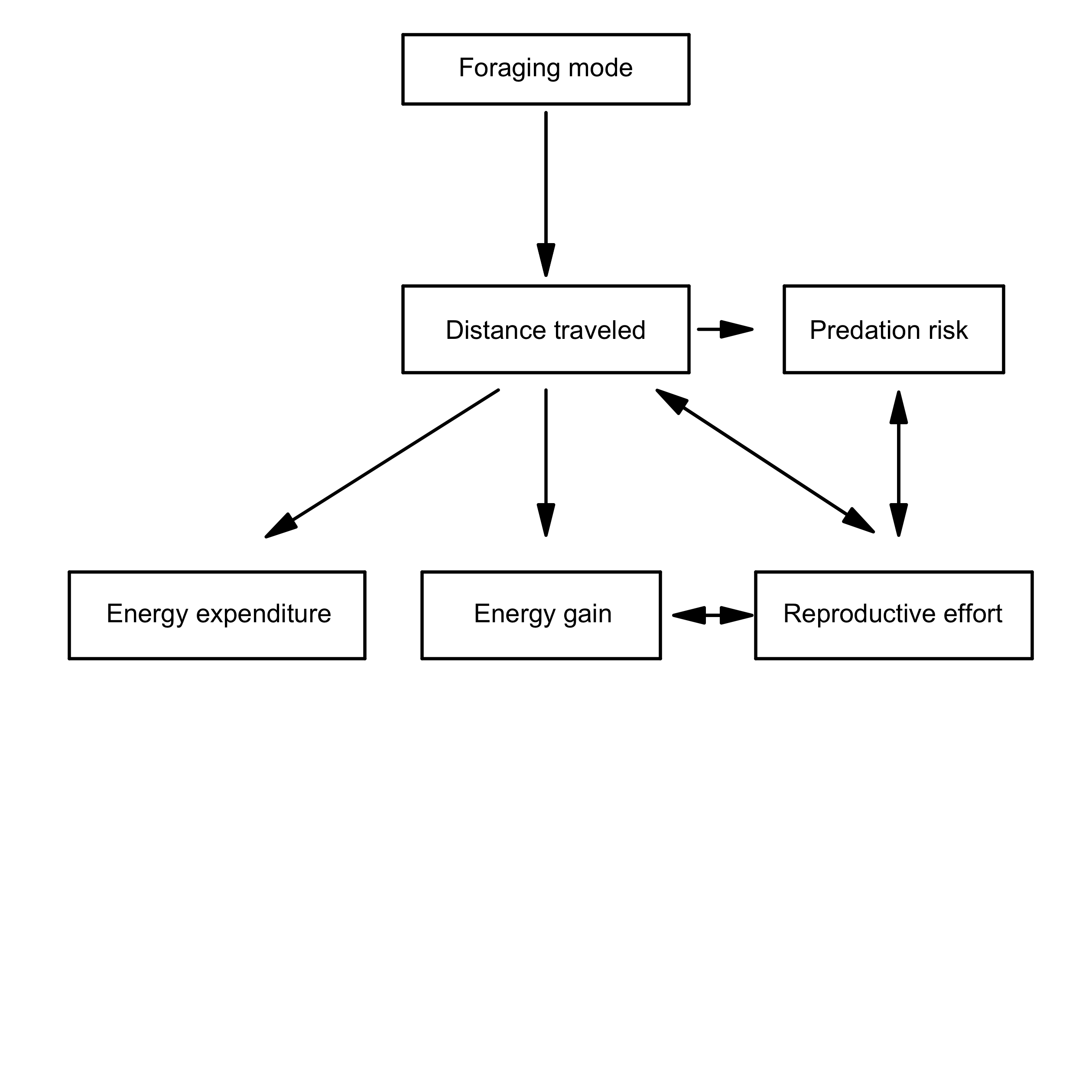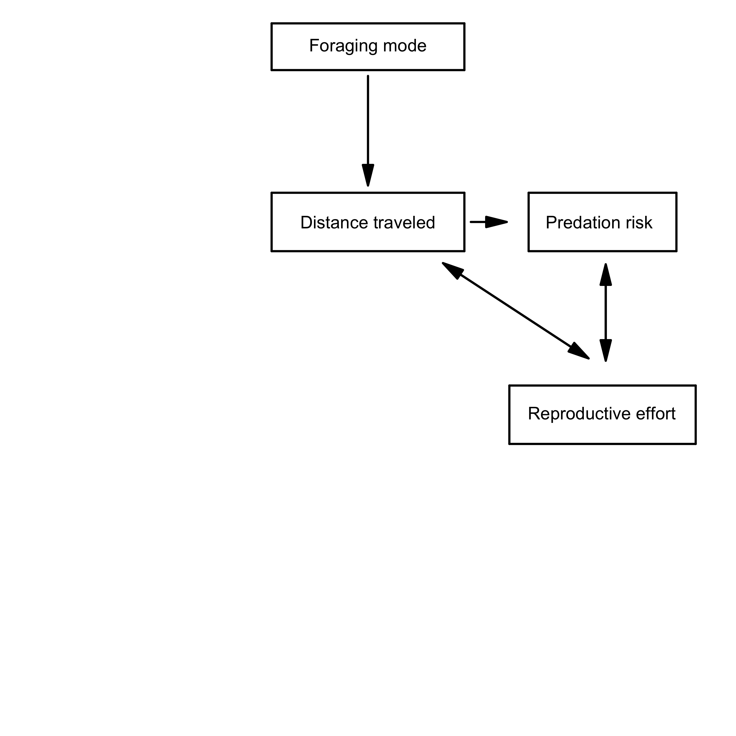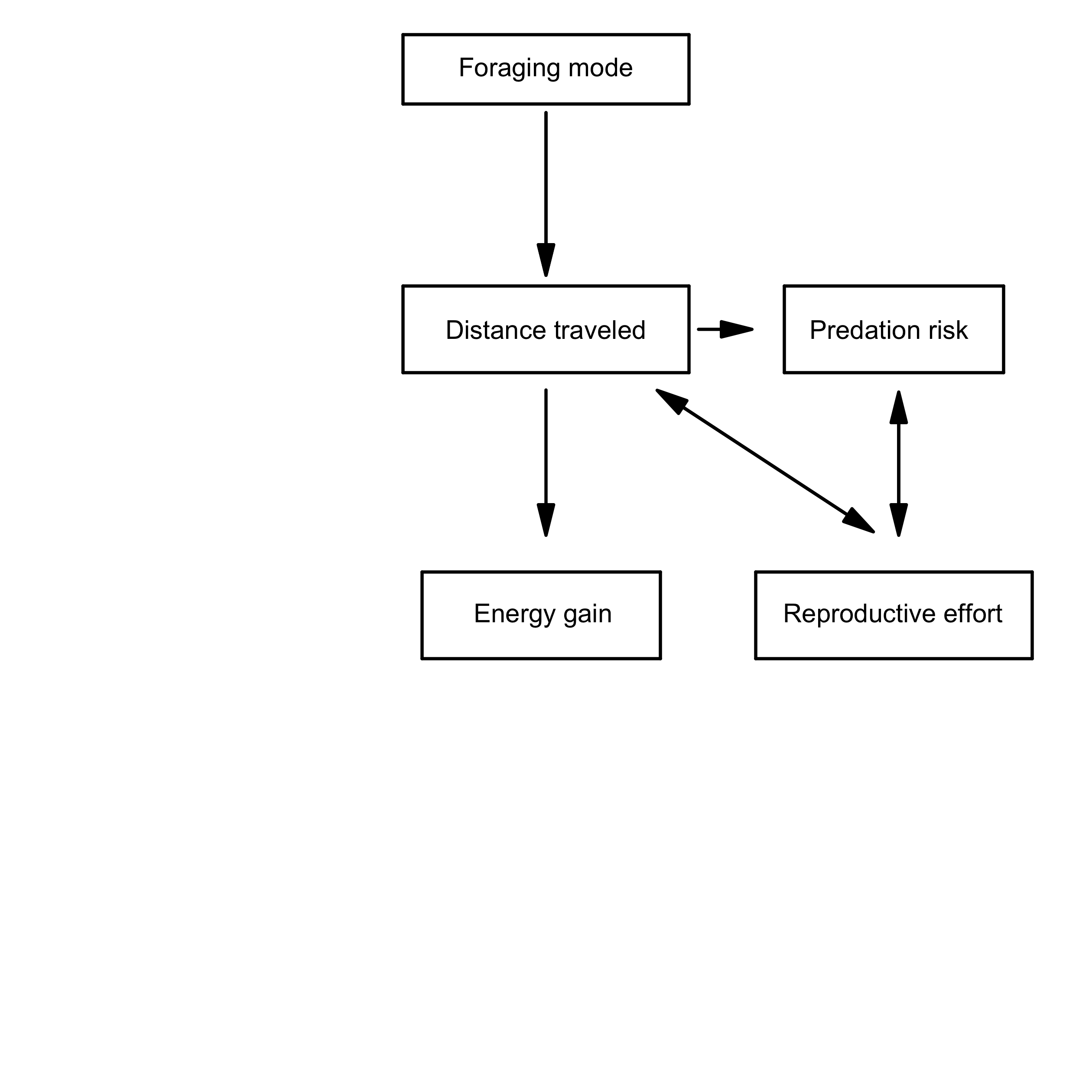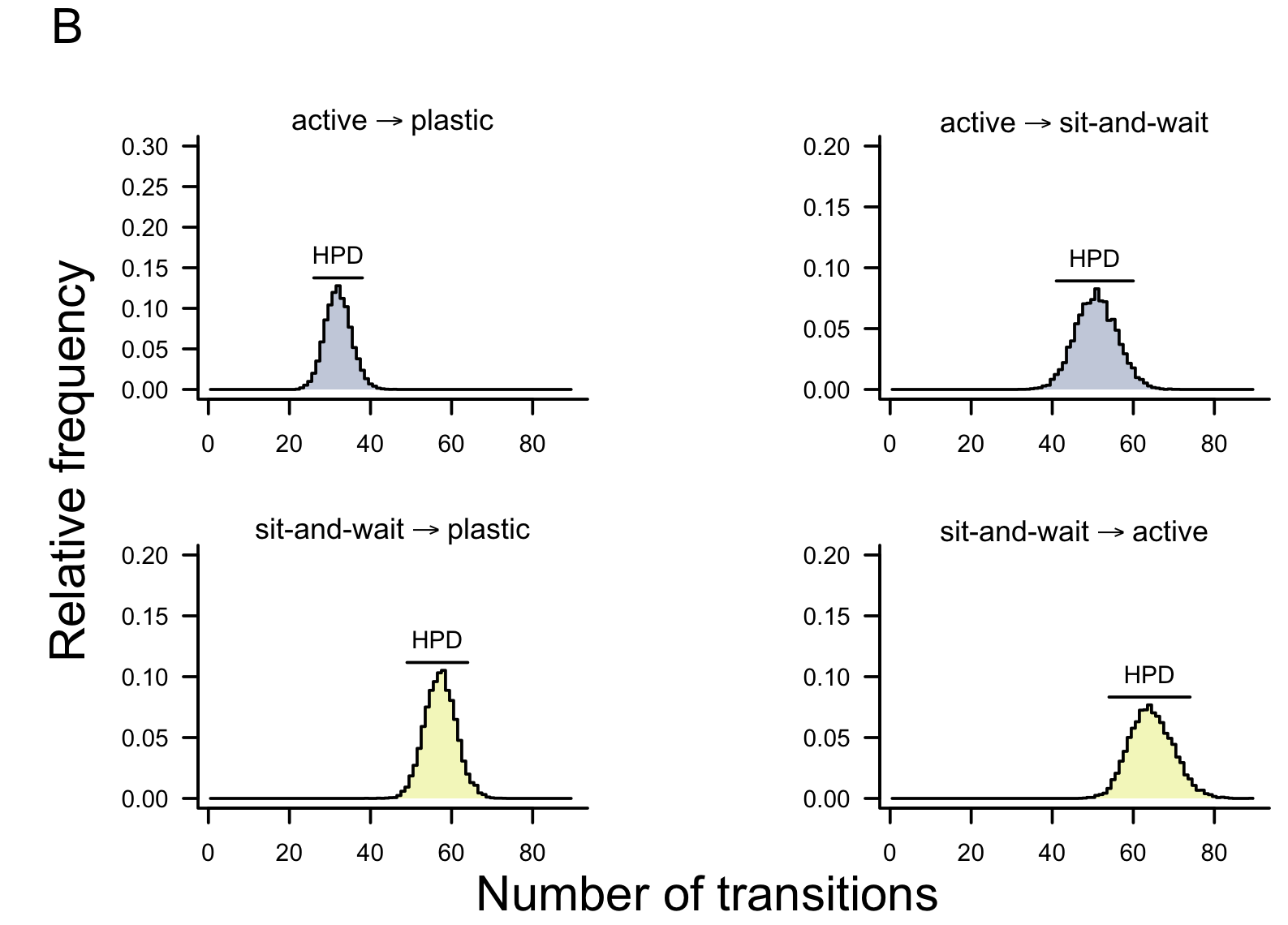 Sit-and-wait -> active foraging (\(\sim64\)), succeeded by Sit-and-wait -> plastic foraging (\(\sim57\))