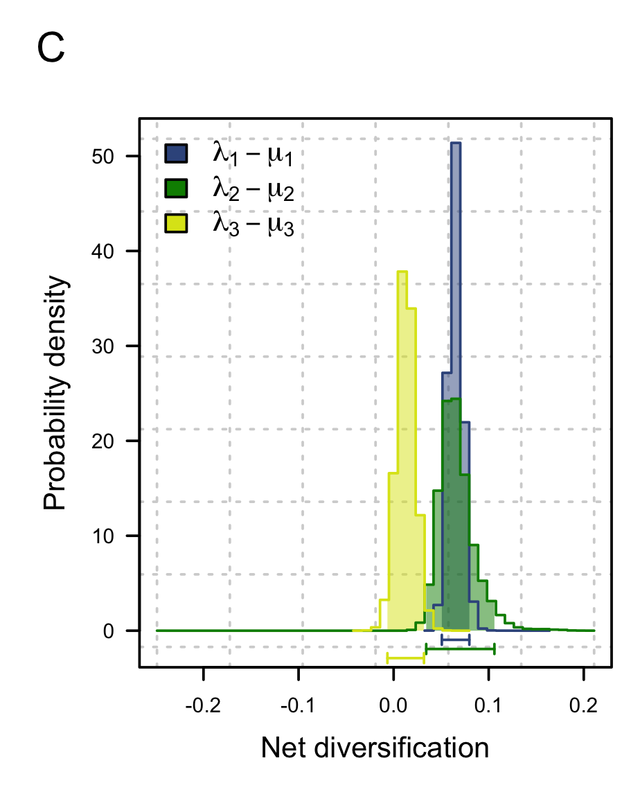 Next, we fitted a model in which all rates of speciation and extinction depended on the character state for our multi-state character